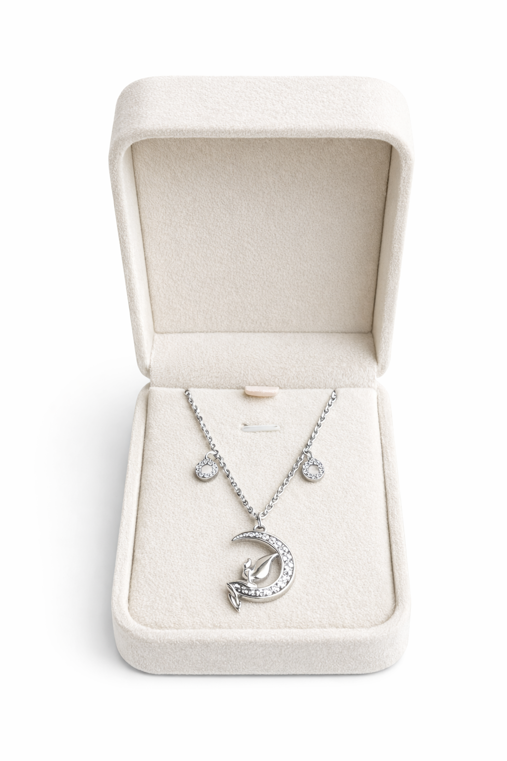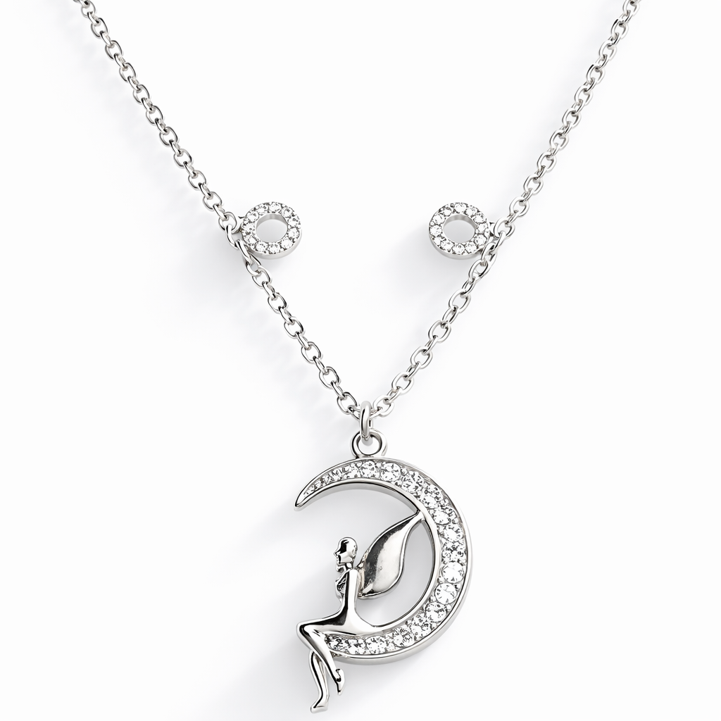 Collier Moon & Fairy en argent 925 – un bijou enchanteur qui capture la magie de la lune et l’élégance féerique. Ce pendentif délicat représente une petite fée posée sur un croissant de lune, symbolisant la grâce, la lumière et la protection. Fabriqué en argent 925 de haute qualité, il allie durabilité et raffinement. Parfait pour apporter une touche de poésie à votre quotidien ou comme cadeau unique pour un être cher.